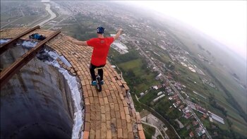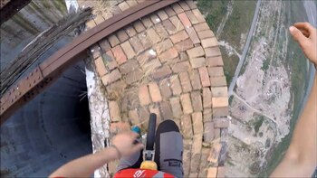 Entre las piruetas que graban con su cámara GoPro, puede verse a los entusiastas Flaviu y Nikolai colgarse de un brazo en el corazón de la chimenea, rodar sobre su uniciclo alrededor de la boca de la estructura, hacer malabares con naranjas mientras caminan sobre una viga… algo que pocos se animarían a hacer.