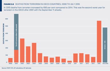 La organización Institute for Economics and Peace (Instituto de Economía y Paz), un centro de estudios que tiene su sede en Sídney, Australia, difundió su "Global Terrorism Index 2016" (Índice del terrorismo mundial), un informe sobre el terrorismo global por los años que van desde 2000 a 2015.
