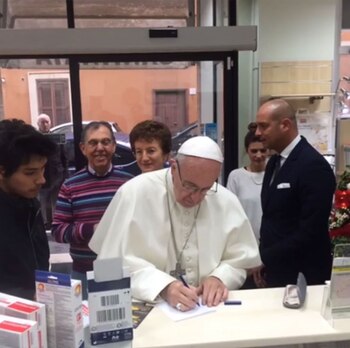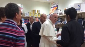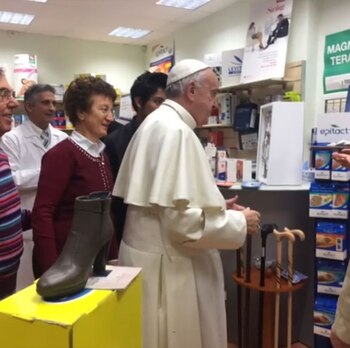 El papa Francisco acudió a una tienda de artículos de ortopedia de Roma, cercana al Vaticano, para comprar personalmente unos zapatos y fue recibido calurosamente por los presentes, quienes aprovecharon para tomarse fotos con el líder católico.