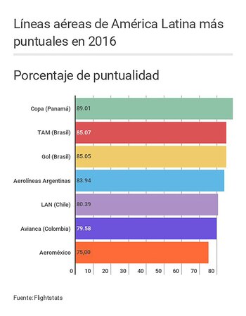 La publicación también realiza rankings regionales. El de América Latina fue liderado por la línea panameña Copa, que alcanzó un 89,01% de puntualidad en sus 122.802 vuelos de 2016. La brasileña TAM, que realizó muchos más vuelos (233.856) y tenía mayor alcance mundial – de hecho fue la única de la región que ingresó al top 10 internacional-, se ubicó segunda en el ranking latinoamericano, con el 85,07% de puntualidad (el ranking la consideró por separado de LAN, con la que se fusionó el año pasado para crear LATAM).