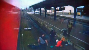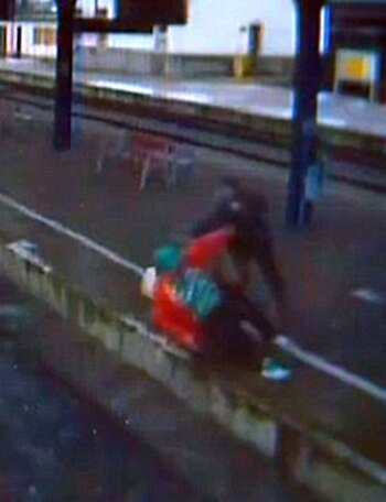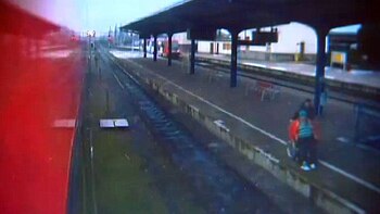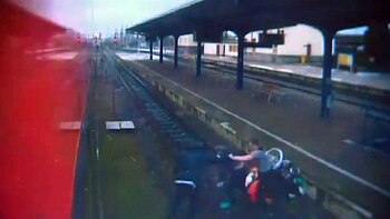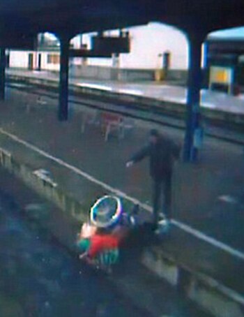 La cinta continúa y la amable charla se convierte en un momento espeluznante: el hombre empuja a la mujer en silla de ruedas a las vías del tren. Salta él también y busca piedras para golpearla brutalmente.