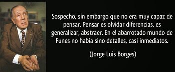 "Sospecho, sin embargo, que no era muy capaz de pensar. Pensar es olvidar diferencias, es generalizar, abstraer. En el abarrotado mundo de Funes no había sino detalles, casi inmediatos."