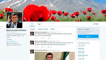 El primer tuit de la cuenta del político ultraconservador, @Ahmadinejad1956, es un video en el que anima a los usuarios de la red social a seguirlo, y declara en inglés: "Soy yo, paz y amor, saludos".