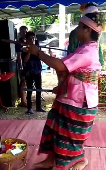 Se dice que el ritual folklórico honra a los espíritus de los antepasados. En este tipo de espectáculos, el supuesto medium solía impresionar a los espectadores al parecer superhumano.