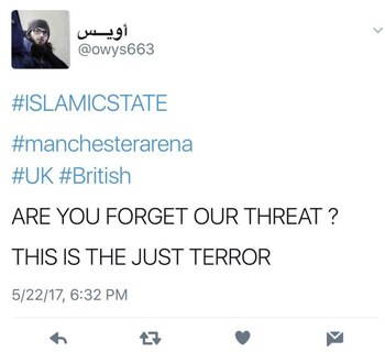 "¿Olvidaron nuestra amenaza?", publicó el usuario @owy663, investigado por las fuerzas de seguridad. El mensaje venía acompañado con la etiqueta #ISLAMICSTATE (Estado Islámico) y #Manchesterarena.