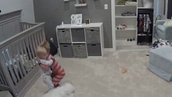 Luego sale de la cuna para alentar al pequeño a que se anime a trepar y escapar.