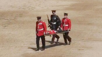 El guardia, que luego atribuyó su colapso a las altas temperaturas de Londres, de entre 26 y 29 centígrados, tuvo el infortunio de caer durante un desfile militar mientras la reina y el resto de la familia real observaba la ceremonia.