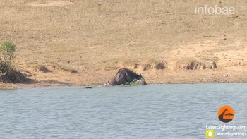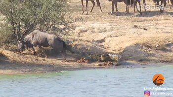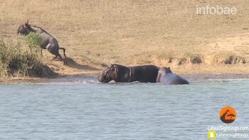 "El ñu quería escapar con fuerza mientras el cocodrilo lo arrastraba hacia atrás. Estaba exhausto", contó Van Wyk. Y luego observaron junto con su esposa que algo se movía en la superficie del agua. Creyeron que eran más caimanes en ayuda del predador. Pero no. Eran dos hipopótamos que atacaron al cocodrilo para que soltara a su presa.