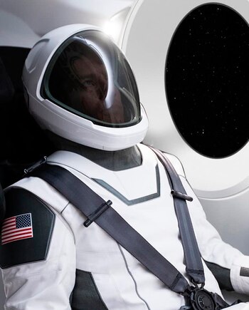 Detrás del vidrio oscuro de un casco blanco (que podría parecerse al de un miembro del dúo electrónico Daft Punk) se puede entrever el rostro de un hombre, asegurado con un cinturón a un asiento y sentado cerca de una ventanilla ovalada. En el hombro derecho, la bandera estadounidense. Musk señaló que se revelará más información en los próximos días.