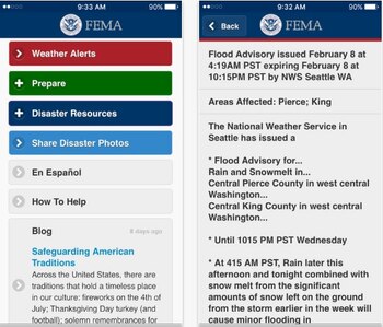 La app oficial de la Oficina de Gestión Federal de Emergencias (FEMA), que está disponible en iOS y Android, abarca información para tener en cuenta en caso de desastres naturales. Se incluye un mapa con las ubicaciones de los centros de recuperación de FEMA, una lista de elementos para tener en el hogar, consejos para mantenerse seguro y puntos de reunión.