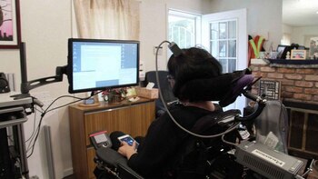 Para mover el cursor, DeGray imagina que su mano está sobre una bola y la gira en cuatro direcciones, como un mouse. Con un teclado en la pantalla, DeGray escribe más de 9 palabras por minuto, letra a letra.