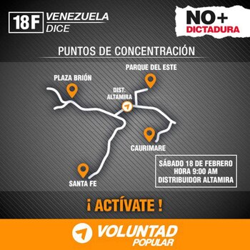Voluntad Popular, el partido fundado por López, convocó oficialmente a la manifestación bajo la consigna "NO+DICTADURA" y fijó a la Plaza Brión, el Parque del Este, Caurimare y Santa Fe como los puntos de concentración en la capital venezolana desde donde se marchará hacia el distribuidor Altamira.
