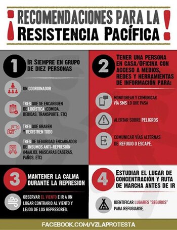 El video concluye con una imagen del momento en que Leopoldo López se entregó a la Justicia en febrero de 2014 e incluye el siguiente subtítulo: "Aprende cómo luchar en: facebook.com/VzlaProtesta", en referencia a una página de la red social que posee infografías como "Recomendaciones para la resistencia pacífica" y "Cómo hacer tu propia máscara anti-gas".
