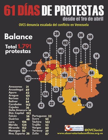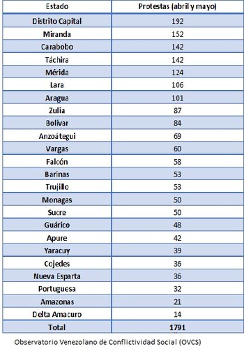 El Observatorio Venezolano de Conflictividad Social (OVCS) detalló que "las acciones de calle" se han extendido en todo el territorio nacional, siendo Distrito Capital, Miranda, Táchira, Carabobo y Mérida los estados que contabilizan mayor número de movilizaciones.