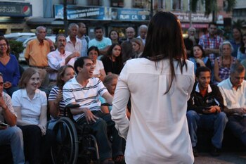 "Me sentía como pez en el agua. Iba con mis Converse, bailaba en plena calle, comía sancocho, tomaba caña con los borrachos y lo disfrutaba. En Catia, si yo me ponía a hacer campaña con una franela amarilla, a saludar gente, nos iban a robar o a disparar los colectivos. Entonces iba sin llamar la atención, con mucho trabajo de calle, de contacto directo, cara a cara, que la gente te tocara… Desde las 6 de la mañana, me montaba en un autobús o en la estación de metro y decía uno por uno que pasaba: 'Hola, soy Marialbert, necesitamos vivir en un país mejor'. Yo les hablaba con la tapa del estómago Hay gente que me decía: 'Mira, tengo los talones agrietados de hacer cola para conseguir una medicina o comida'… Y yo iba a la radio y contaba eso y le pedía explicaciones a Nicolás (Maduro) por la señora que tiene los talones agrietados y no consigue comida. Mi compromiso era que tú me vas a volver a ver y que voy a hacer oír tus problemas".