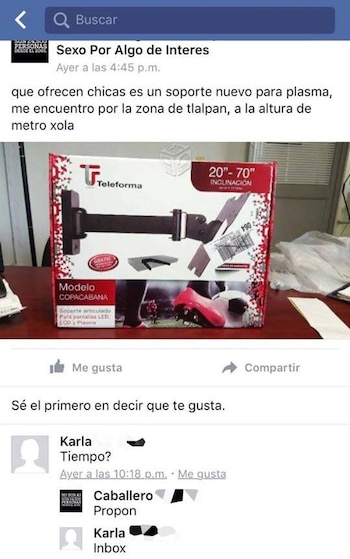 Sin embargo, el lugar más directo para intercambiar sexo por artículos o servicios es Facebook. Un grupo cerrado creado apenas hace un par de años bajo el nombre "DF Trueque x sexo" mantiene hasta hoy 118 miembros, incluyendo a Mariana y a Pancho.