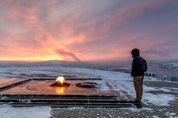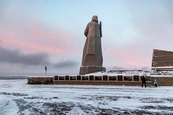El último día, el Ártico nos regaló una buena oleada de frío gélido mientras subíamos la colina que había detrás de nuestro hotel para contemplar el Alyosha, un gigantesco soldado soviético de 15 metros de altura, guardián pétreo de la ciudad y monumento conmemorativo de todos los que murieron luchando en el que probablemente fuera uno de los frentes más duros que jamás se hayan conocido. Cuando alcanzamos la cumbre de la colina, prácticamente no sentíamos las extremidades.