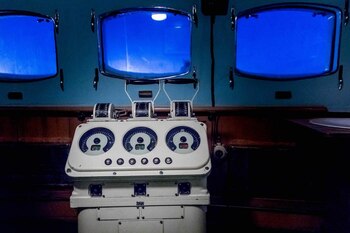Durante nuestro primer día en Murmansk visitamos el Rompehielos Lenin, la atracción turística más preciada de una ciudad a la que no va ningún turista. El Lenin se construyó en 1959 y fue el primer buque propulsado por energía nuclear del mundo. Hicimos una visita guiada por el puente, los camarotes y, cómo no, los reactores nucleares. Aunque hace tiempo que fueron desmantelados, hay una escena con maniquíes equipados con trajes antirradiación simulando la carga de tubos de uranio 235 en el reactor que me recordó a cuando a Homer Simpson se le cayó una de esas barras por dentro de la camisa.