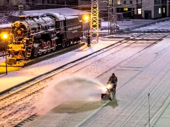 El ferrocarril ruso termina en la ciudad de Murmansk, a dos grados al norte del círculo ártico. Una línea férrea de 28.000 kilómetros de longitud para el transporte de pasajeros y carga que muere aquí, ya que más allá solo está la inmensidad gris del Océano Ártico.