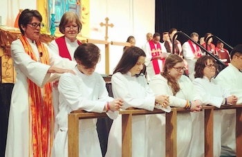 "Derrama tu Espíritu Santo sobre M", dijo la obispo. "Envíalos ahora para anunciar las buenas nuevas de Jesucristo, para anunciar el reino de Dios y para preparar a la iglesia para el ministerio".