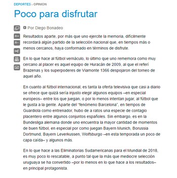"Resultados aparte, por más que uno ejercite la memoria, difícilmente recordará algún partido de la selección nacional que, en tiempos más o menos cercanos, haya conformado en términos de disfrute", comenzó la última nota de Diego Bonadeo, publicada el domingo pasado en Página 12.