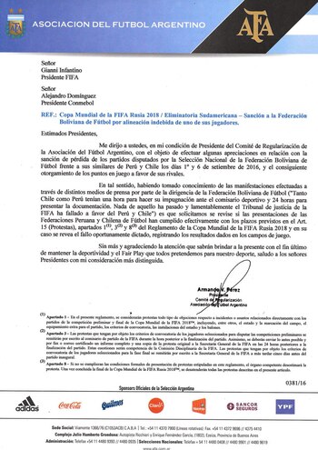 "Me dirijo a ustedes, en mi condición de presidente del Comité de Regularización de la Asociación del Fútbol Argentino, con el objeto de efectuar algunas apreciaciones en relación con la sanción de pérdida de los partidos disputados por la Selección Nacional de la Federación Boliviana de Fútbol frente a sus similares de Perú y Chile los días 1° y 6 de septiembre de 2016, y el consiguiente otorgamiento de los puntos en juego a favor de sus rivales.