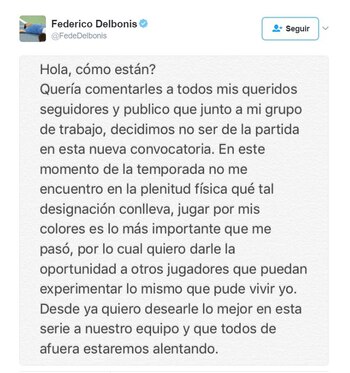 Federico Delbonis utilizó su cuenta en Twitter para explicar por qué decidió bajarse del equipo de Copa Davis que en febrero próximo iniciará la defensa del título ante Italia.