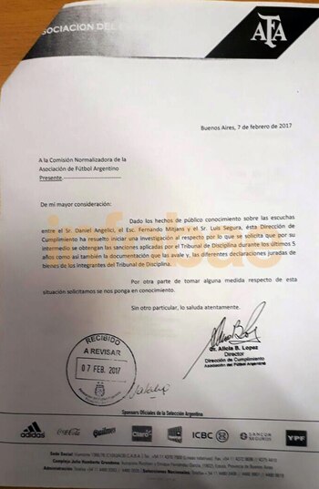 En el escrito, la Dirección de Cumplimiento pidió "iniciar una investigación" luego de la filtración de audios de escuchas telefónicas protagonizados por el presidente de Boca, Daniel Angelici, el vicepresidente del comité de Apelaciones, Fernando Mitjans, y el ex presidente de la AFA, Luis Segura.