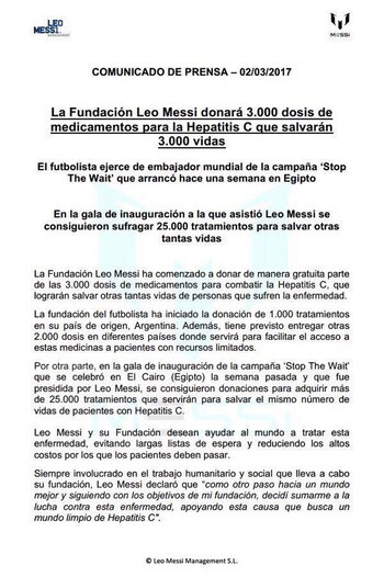 Lionel Messi, a través de su fundación, anunció la partida de 1000 dosis con medicamentos para el tratamiento de la hepatitis C en Argentina. Además, distribuirá otras 2000 dosis que serán repartidas a pacientes con recursos limitados de diferentes países con el objetivo de combatir la enfermedad.