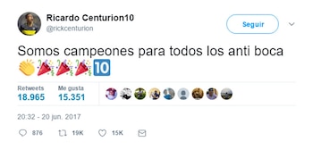 Apuntado como un personaje polémico dentro del ámbito del fútbol, Ricardo Centurión no quiso ser menos el día de la consagración de Boca. Luego del triunfo de San Lorenzo ante Banfield, que sentenció el título xeneize, el volante ofensivo publicó un mensaje en su cuenta de Twitter que tuvo una notable repercusión en cuestión de minutos.