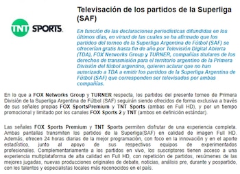 En función de las declaraciones periodísticas difundidas en los últimos días, en virtud de las cuales se ha afirmado que los partidos del torneo de la Superliga Argentina de Fútbol (SAF) se ofrecerían gratis hasta fin de año por Televisión Digital Abierta (TDA), FOX Networks Group y TURNER, compañías titulares de los derechos de transmisión para el territorio argentino de la Primera División del fútbol argentino, quieren aclarar que no han autorizado a TDA a emitir los partidos de la Superliga Argentina de Fútbol (SAF) que corresponden ser televisados por ambas compañías