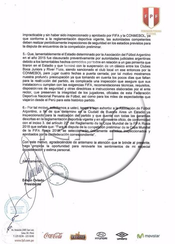 El sitio RPP Noticias de Perú dio a conocer la carta membretada en la que la Federación de ese país expresa a Fatma Samoura y Gordon Savic, autoridades de la FIFA, su sorpresa por la propuesta de la AFA de jugar el partido en un estadio en el que la Argentina no se ha presentado en lo que va de la Eliminatoria, en alusión al estadio de Boca Juniors.
