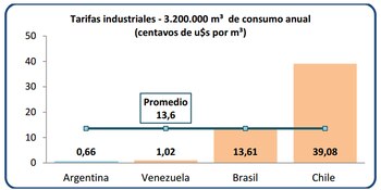 El CERES indicó que en Uruguay se paga entre 1,12 y 1,49 dólares por metro cúbico, según el nivel de consumo, mientras que en Chile el rango va de 0,74 a 1,14 dólar. Sólo grandes productores y exportadores, como Bolivia y Venezuela, pueden exhibir precios inferiores a los de la Argentina.