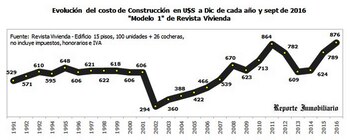 En comparación con diciembre de 2015, el aumento del costo del metro cuadrado subió 11%, desde los USD 789 de finales del año pasado.