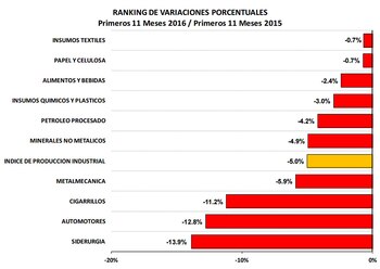 Por su parte, la industria automotriz en el acumulado para el periodo enero-noviembre muestra un retroceso interanual de 12,8%, mientras que la industria siderúrgica cierra el ranking de crecimiento con una contracción de 13,9% respecto a los primeros once meses de 2015.