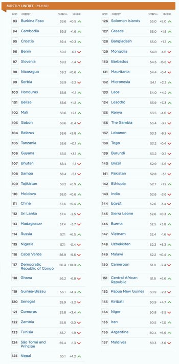 Sobre la base de una puntuación media, cada uno de los 186 países calificados en el Índice de 2017 de The Heritage Foundation se clasifica como: "libres", cuando alcanzan una puntuación promedio de 80 o superior; "mayormente libre" de 70 a 79,9 puntos; "moderadamente libre" de 60 a 69,9; "mayormente controlada" de 50 a 59,9; o "reprimido" menores de 50 puntos. La Argentina, logró, por unas décimas salir del final de la tabla.