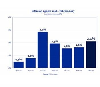 Según el IPC Congreso, que promedia las mediciones de las consultoras, en febrero la inflación alcanzó el 2,1% mientras que en los últimos 12 meses se registró un alza del 34,3 por ciento.