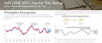 El Índice General de Expectativas Económicas (IGEE) de los argentinos elaborado por Kantar TNS Gallup en el mes de enero mostró una caída de 2 puntos con respecto a diciembre del 2016. Estos datos corresponden a un monitoreo mensual que la consultora realiza en la Argentina desde 1982. Por medio de este estudio, la compañía mide las expectativas sobre actos económicos que repercuten en las decisiones de consumo y en la evolución de la economía en el corto plazo.