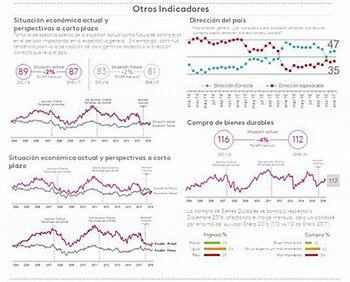 El informe de febrero destaca con respecto a la evolución del IGEE de enero los siguientes aspectos. "En el comienzo del año, el índice mostró una caída de 2 puntos con respecto a diciembre del año 2016. Tanto la perspectiva acerca de la situación actual como futura se contrajeron en el período impactando en la expectativa general. Sin embargo, continuó con tendencia positiva la percepción de los argentinos respecto a la dirección correcta que lleva el país", dice el informe. El IGEE es un indicador multidimensional que registra la opinión de la población acerca la situación económica el país. Se obtiene a partir de una encuesta con alcance nacional realizada mensualmente generando una tendencia desde 1982.