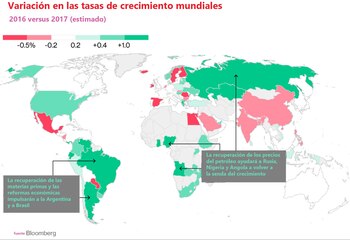 Según las proyecciones de los analistas consultados por Bloomberg, el crecimiento en la Argentina "podría acelerarse en más de 5 puntos porcentuales este año", al pasar de -2,1% en 2016 a 3% en 2017, aunque advirtió que dicha tasa podría acarrear la continuidad de un proceso de "alta inflación".