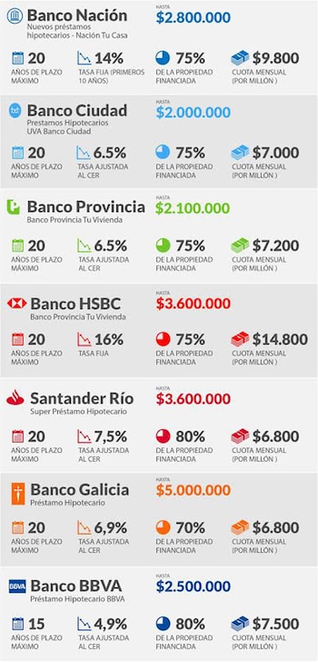 Como se puede observar es muy amplia la oferta de créditos hipotecarios con tasas, plazos y requisitos diferentes por lo tanto se debe analizar varias posibilidades en diferentes bancos para acceder a un crédito. Los bancos HSBC y el BBVA ofrecen este tipo de créditos. "Nuestro producto estrella del HSBC, que es la financiación a 10 años con una tasa fija del 16%, por un monto máximo de $3,6 millones pero el plazo puede duplicarse, pero aplicando una tasa variable", manifestó a Infobae Federico Etiennot, Director de Comunicaciones del banco. En tanto el BBVA Frances es otro de los bancos que da hipotecas a una tasa fija del 19 por ciento.