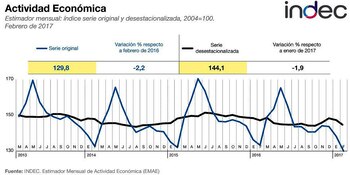 El Instituto Nacional de Estadística y Censos (INDEC) informó que la actividad económica en febrero cayó 2,2% en comparación al mismo mes de 2016 y quebró dos meses en expansión interanual.
