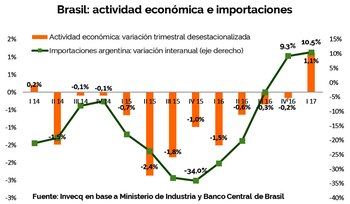 "Junto con la reactivación del nivel de actividad del país vecino se habían recuperado las compras de bienes argentinos. En los primeros tres meses del año, las importaciones de Brasil habían crecido un 10,5% en términos interanuales luego de incrementarse en 9,3% en el último trimestre de 2016", refirió el análisis de Invecq.