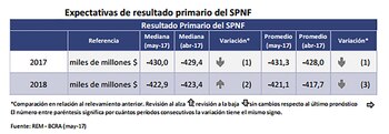 Los participantes del REM esperan un déficit primario del Sector Público Nacional no Financiero (SPNF) de $430 miles de millones para 2017, el cual se acotaría hasta $423 miles de millones en 2018. Las proyecciones se mantienen prácticamente inalteradas respecto de un mes atrás.