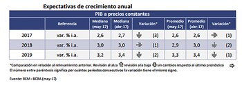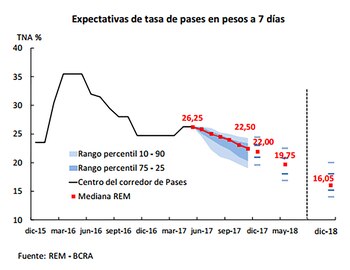 "Los participantes del REM esperan que la tasa de política monetaria se reduzca durante junio respecto de los valores de mayo del 26,25% anual. Además se pronostica una disminución gradual, a medida que se avance en el camino de la desinflación, hasta un valor de 22% para fin de año pero por encima del 22,5% anual de la estimación del mes pasado. Para diciembre de 2018 se espera una tasa de 16,10% con una leve corrección al alza por sexta vez", dice el informe del BCRA.