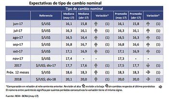 En lo que respecta a los pronósticos del nivel de tipo de cambio nominal, el promedio esperado para los próximos 6 meses de 2017 se ubican entre 16,1 y 17,4 pesos por dolar, con modificaciones al alza respecto del relevamiento anterior. "A fines de 2017, el nivel del tipo de cambio nominal alcanzaría los 17,70 pesos, un 12% de aumento con respecto al pronóstico previo del mes pasado. En tanto que la proyección para diciembre de 2018 se elevó a 20,1 pesos por dolar", expresa el informe del BCRA.