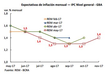 En cuanto a la inflación esperada para el corriente año, los analistas pronostican una variación interanual de los precios para diciembre de 2017 de 21,6% contra el 21% del relevamiento del mes anterior. Con respecto del mediano plazo, se corrigieron las proyecciones de inflación minorista. "Además de lo ya mencionado para 2017, las revisiones más importantes respecto del mes pasado se concentraron en la inflación esperada para el futuro. La inflación anual esperada para 2018, se incrementó 0,4% al 15% anual y la correspondiente a 2019 subió a 10,2% anual.