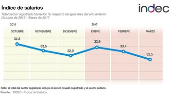 El ente que conduce Jorge Todeca señaló que el Índice de Salarios del total del sector registrado aumentó 32,5% interanual en marzo de 2017, apenas debajo de la inflación del período, de 33% anual, según el IPC Congreso de marzo último.
