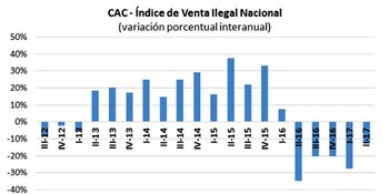 En el segundo trimestre de 2017, la venta ilegal callejera a nivel nacional –medida a partir de la cantidad de puestos observados– registró una baja interanual de 12,3% –esto es, respecto al segundo trimestre de 2016–. Es lo que se desprende del Informe de Venta Ilegal Callejera en la República Argentina elaborado por la Cámara Argentina de Comercio y Servicios, y que cubre actualmente a once importantes ciudades del país: Buenos Aires, Rosario, Salta, Neuquén, Posadas, Mendoza, Paraná, Santa Fe, San Miguel de Tucumán, La Plata y Córdoba.