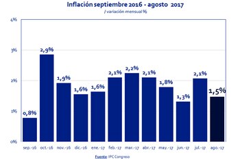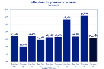 El IPC Congreso, estimación de la inflación en base a informes privados y públicos que difunden legisladores de la oposición, alcanzó 1,5% en agosto, para promediar 1,8% por mes en los primeros ocho meses de 2017.